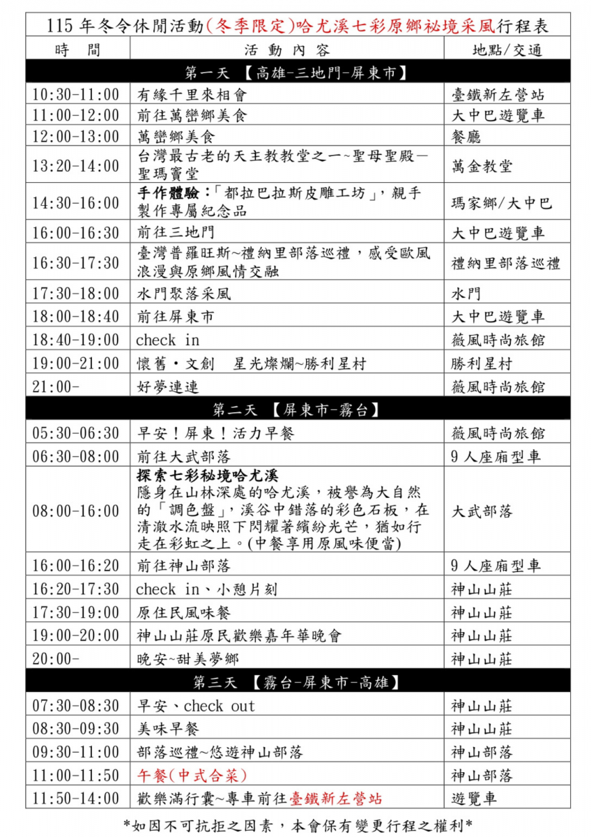 冬季限定的「哈尤溪七彩秘境」美景令人驚艷,高聳的峽谷、紋理分明且色彩繽紛的七彩岩壁,再加上被譽為「雲豹之湯」的野溪溫泉與清澈見底的溪水,成為近年來爆紅的旅遊勝地。活動結合都拉巴拉斯皮雕工坊DIY、臺灣普羅旺斯—禮納里部落、勝利星村、神山部落之旅,以及道地的原住民風味餐,由部落達人帶領民眾深度體驗排灣文化,感受滿滿的『原』汁『原』味感動。