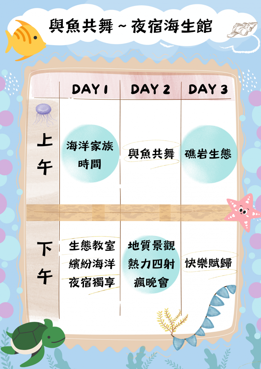 1.專人帶領認識海洋多樣生物,學習海洋多元新知,真實體驗與海洋魚類共眠。