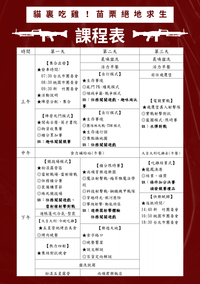 2.活動地點橫跨苗栗最具話題的特色景點——尚順育樂天地、飛鷹堡、粉漾露營區,打造多重關卡任務與競技對戰,結合觀光與遊戲體驗,挑戰指數爆表!