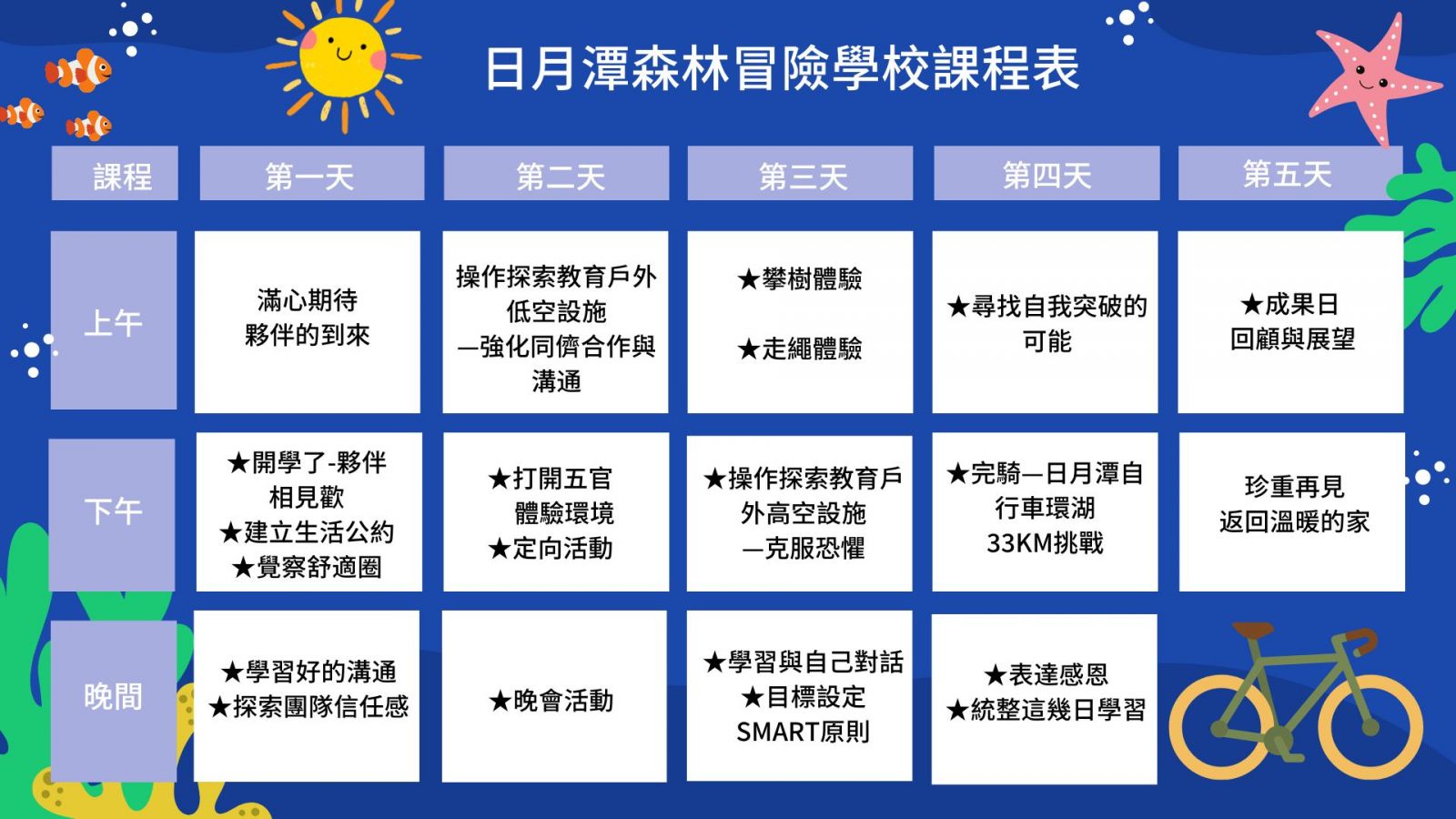 This is a camp that breaks through the previous activity model. In view of Taiwan’s traditional education environment, it is difficult to find good life thinking and character education courses for children. Therefore, this camp was planned with reference to the model of the Adventure School in Teheyi, New Zealand, and combined with the school spirit of the outreach school OUTWARD BOUND SCHOOL. The ratio of counselors to students is 1:8. The course content adopts AE (Adventure Education) experiential education and nature experience Carnell courses and outreach school adventure courses. The curriculum is diversified: including low-altitude exploration courses, high-altitude rope courses, wilderness safety awareness, forest experience and a 33KM bicycle challenge around the Sun Moon Lake. The coaching team provides a set of logic and techniques to guide reflection to guide students from experience to realization.