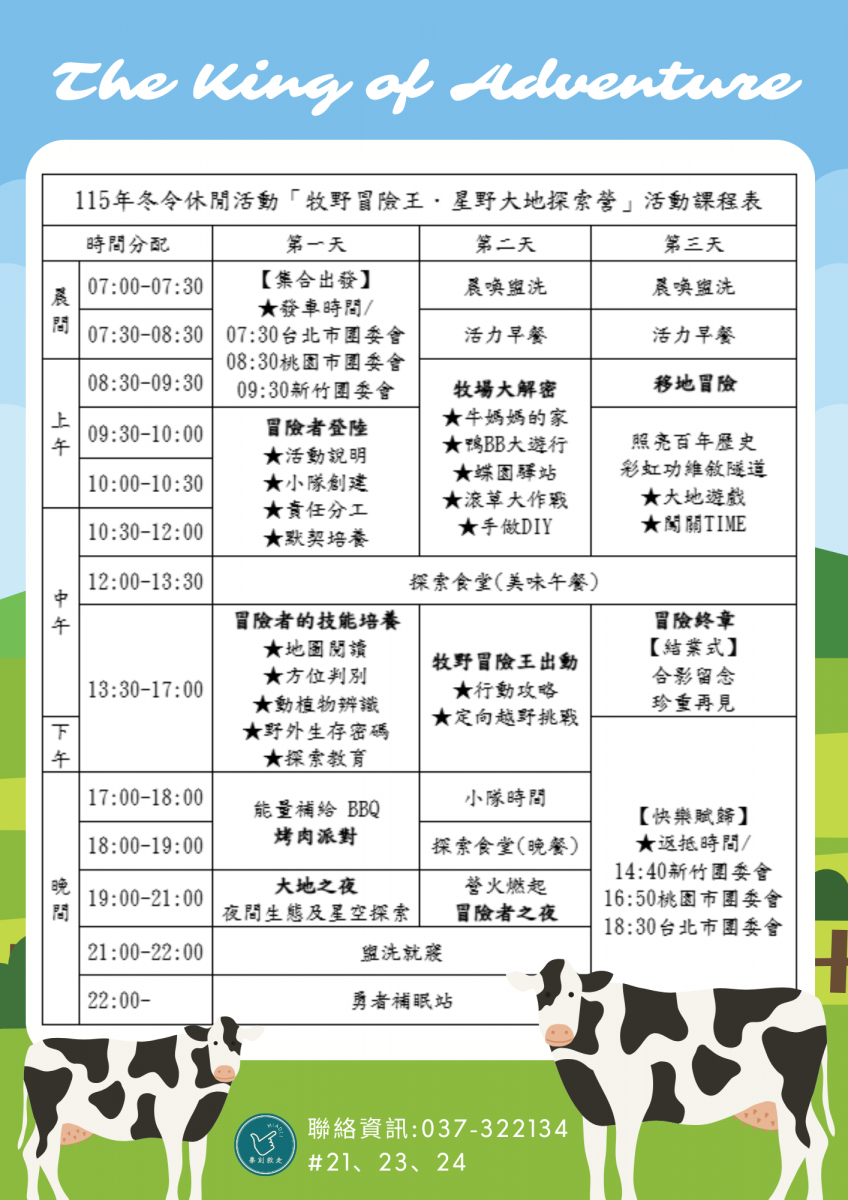 在這片廣闊的牧野中,冒險者們將展開一段充滿探索與挑戰的旅程。從地圖與方位辨識、動植物觀察到野外求生技能培養,每一步都帶領學員親近自然、鍛鍊觀察力與團隊合作精神。牧場互動活動更是亮點所在,學員可親手餵牛、參與鴨子遊行、滾草堆及手作DIY,深入了解牧場生態與乳牛生活,體驗趣味農業魅力。夜幕低垂時,星空下的夜間生態導覽與營火晚會,搭配香氣四溢的烤肉,為每個冒險日畫下難忘的尾聲。