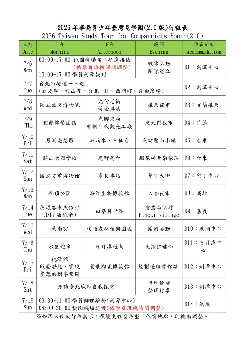 ◎本次營隊活動中有關旅遊、食宿、交通安排由中國青年旅行社或嚕啦啦旅行社辦理。