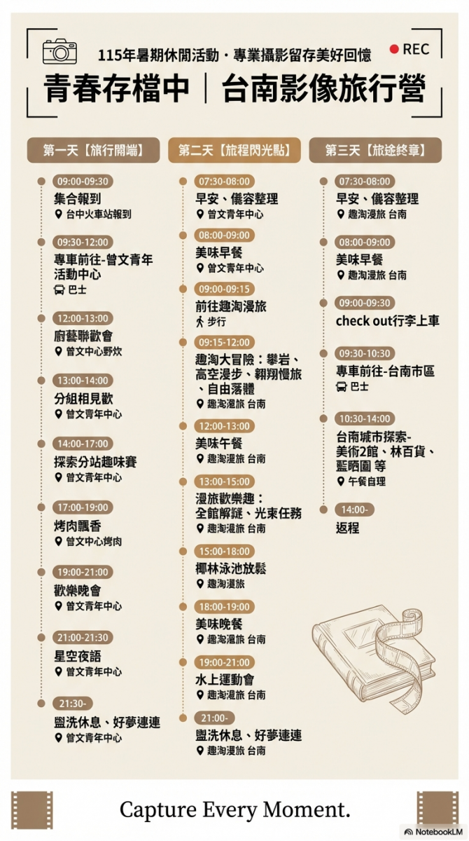 這個營隊最特別的,不只是行程好玩,而是整趟旅程都將被細細收藏。全程有專業攝影師隨團跟拍,不必擔心只剩模糊自拍或匆忙合照,而是真正把每個自然的笑容,每次投入的瞬間、每段與朋友一起瘋玩的畫面,好好拍下來。除此之外,活動也將全程錄影,最後剪輯成一支專屬青春 VLOG,讓這三天兩夜不只是回憶,而是一支可以反覆重播的青春作品。在最好拍的場域,遇見最真實的自己;在最好玩的旅程裡,留下最值得珍藏的青春。