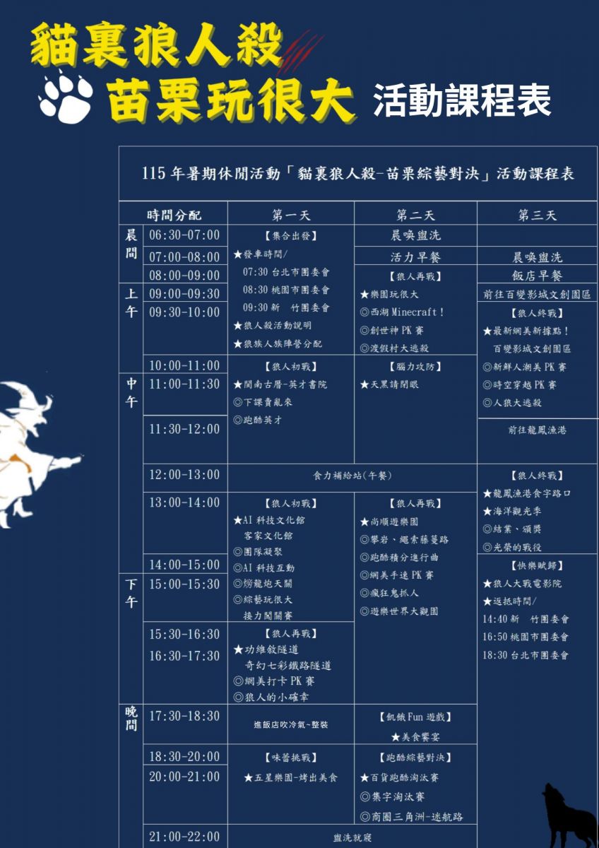 傳說古早貓裏時期,有人族與狼族在苗栗這片土地上爭奪領域,而你寒假將扮演不同的角色參與這場貓裏狼人爭霸戰,完成任務並獲勝者,將封給<苗栗國之民>至高無上的尊榮稱號。