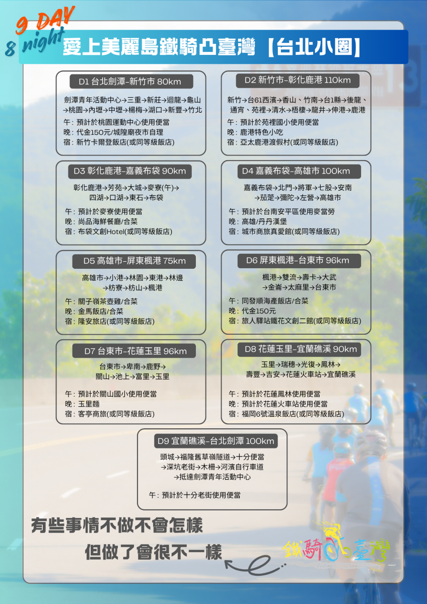 本次營隊規劃全程單車環台挑戰,騎行距離約1,100公里,讓參與者親身體驗台灣多變的地理風貌,從海岸線到山城,每一段路程都充滿挑戰與驚喜,提升體能與毅力,同時培養團隊合作精神。