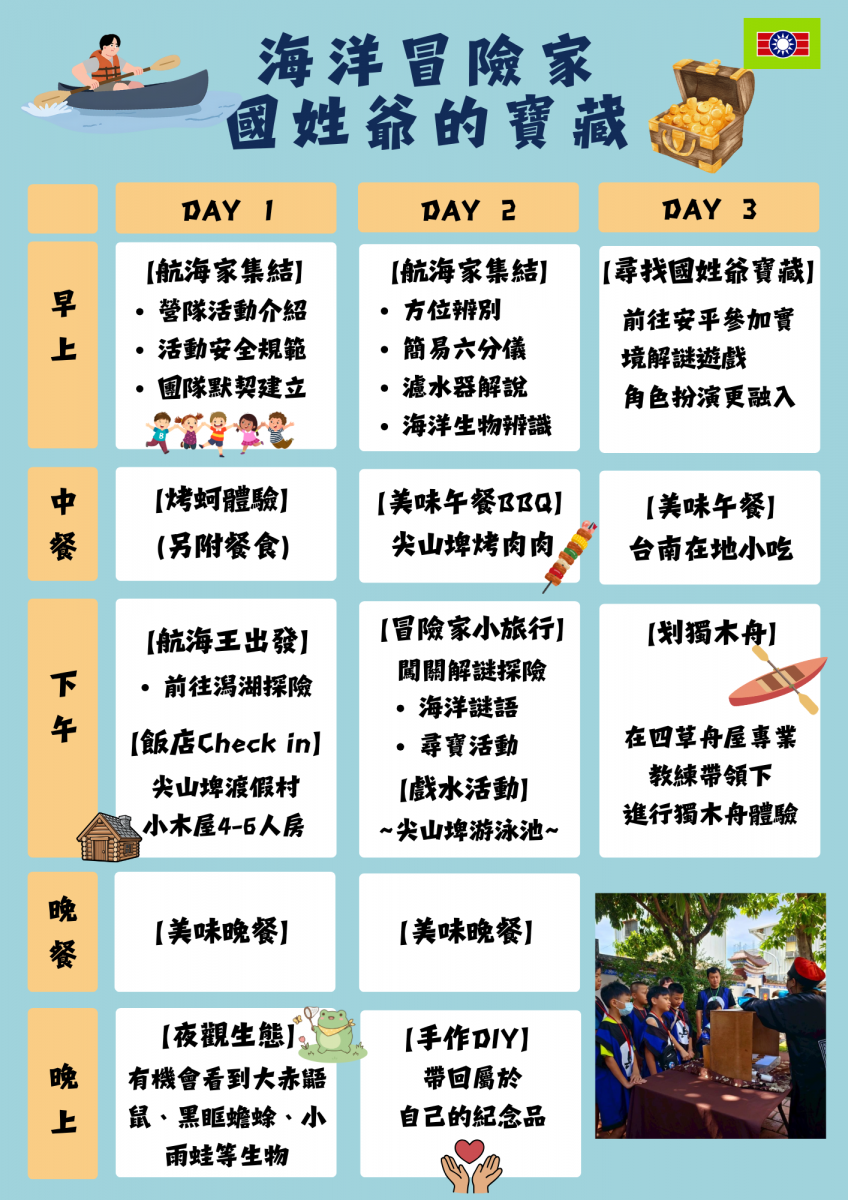 「海洋冒險家:國姓爺的寶藏」是以台南海洋文化為背景的三天兩夜深度體驗營。孩子們化身小小航海冒險家,透過故事引導與任務設計,踏上歷史尋寶與海洋探索之旅。營隊安排安平歷史場域實境解謎,在趣味的遊戲中了解歷史文化;乘船穿梭潟湖,了解自然生態;在四草舟屋進行獨木舟活動,體驗水上活動、培養孩子新興趣。夜間則透過生態夜觀,體驗生命與自然的連結。營隊結合定向探索、團隊任務與生活自理訓練,孩子在分工合作中建立默契、培養自信與紀律。住宿於尖山埤渡假村,四至六人一房,提供舒適衛浴與生活機能,讓孩子安心休息、迎接挑戰。這不僅是一場營隊,更是一段孩子專屬的探索與成長記憶。