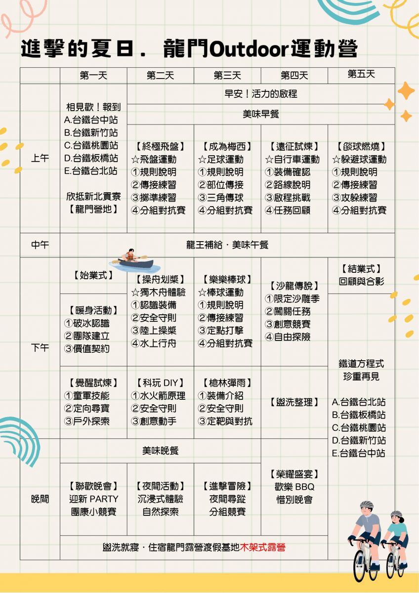 迎接夏日,啟動孩子的冒險能量!在充滿陽光的季節裡,體驗一場結合戶外運動、團隊合作、探索挑戰與生活體驗的【進擊的夏日~龍門Outdoor運動營】。透過多元且漸進式的教學及引導,帶領孩子在安全又有趣的自然環境中,勇敢嘗試、突破自我!