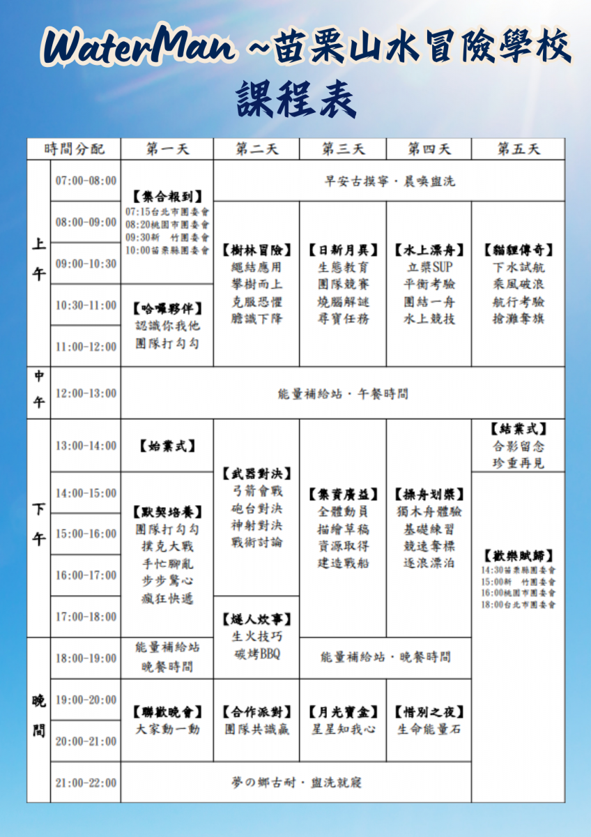 Come to Miaoli and become an Aquaman Warrior of the Lost Kingdom! Get ready for epic water battles, SUP balance challenges, kayak racing, outdoor escape room puzzles, and a "MasterChef" style cooking competition! Let’s turn this summer into a high-energy variety show!