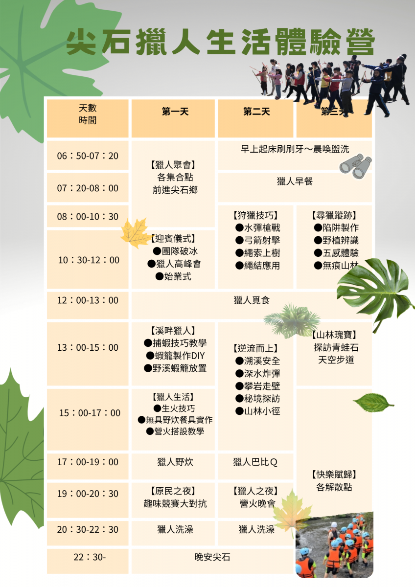 Participants will travel to the indigenous mountain village of Jianshi in Hsinchu, where they will connect with nature and experience the lifestyle and wisdom of the local indigenous community. The program features a wide variety of hands-on activities, including making traditional hunting traps, creating shrimp cages, catching shrimp in mountain streams, archery, tree climbing, water blaster challenges, river tracing, cooking bamboo tube rice, identifying wild mountain plants, and enjoying a fun-filled campfire night.