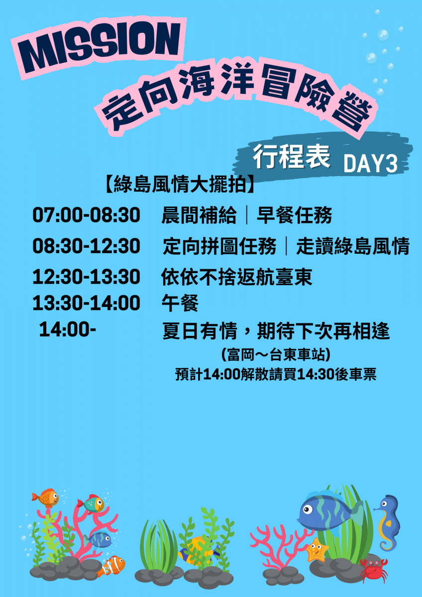 本活動以「MISSION 綠島」為主軸,結合定向探索、海洋體驗與團隊合作,打造一場兼具冒險感與學習深度的三天兩夜島嶼行動。學員自台東集結出發,跨越太平洋前進綠島,在任務引導下逐步走進島嶼場域,透過互動破冰與團隊建立,開啟海洋冒險序章。活動融入藍洞與秘境探索、浮潛體驗及海洋生態觀察,讓學員親身感受清澈海域與豐富生命力,培養對自然環境的認識與尊重;夜間安排前往朝日海底溫泉,在星空與海浪陪伴下,體驗綠島獨有的自然景觀。後續行程以定向方式串聯島上重要人文與自然景點,透過行動與觀察,逐步拼湊綠島的歷史、文化與風景記憶,完成專屬於自己的冒險地圖。全程住宿安排於綠島凱薪飯店或同級,採飯店式多人房型,環境安全舒適,兼顧團體生活與休息品質,讓學員在充實探索中獲得完善照顧。