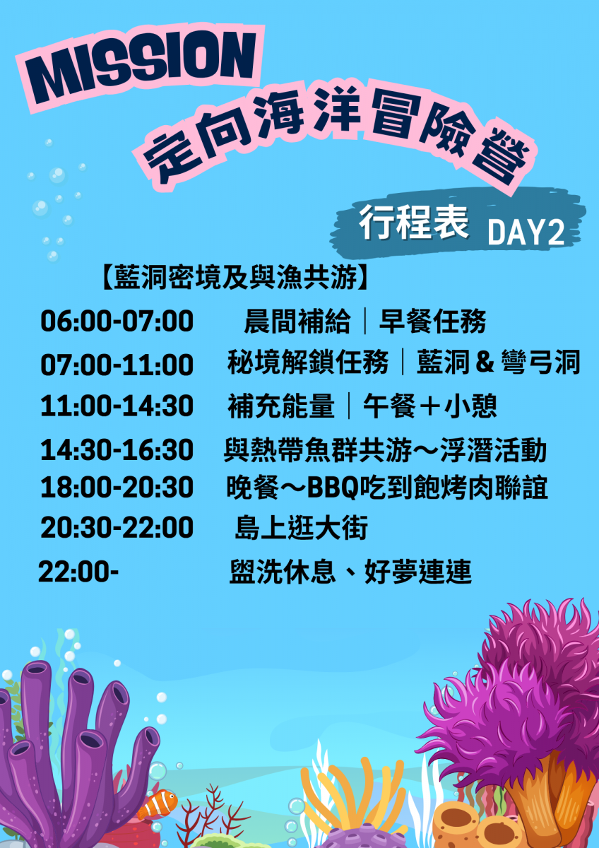 3.藉由浮潛、探險與定向任務,鼓勵學員嘗試新經驗、突破自我限制,提升自信與行動力;同時在團隊合作中完成任務,培養溝通、協調與責任感,使學員在冒險與探索中累積深刻且難忘的學習回憶。